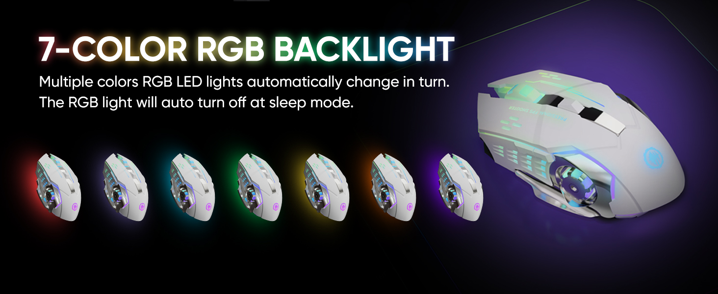No working for 1 minute, the mouse will enter shallow sleep mode; No working for 10 minutes, and the mouse will enter deep sleep mode. Just click the left or right button to wake it up. At sleep mode, the RGB light will turn off, and the power consumption will be low.