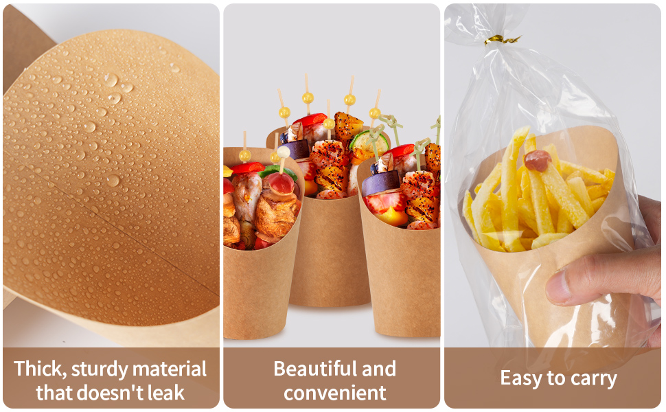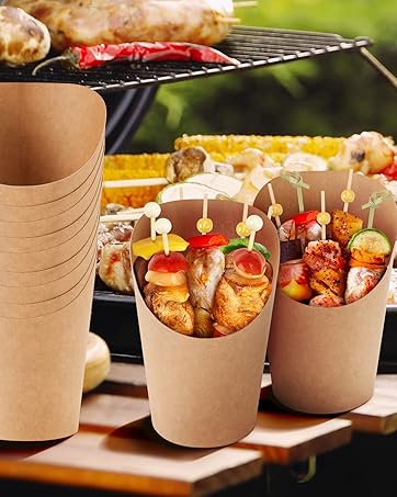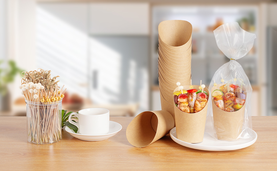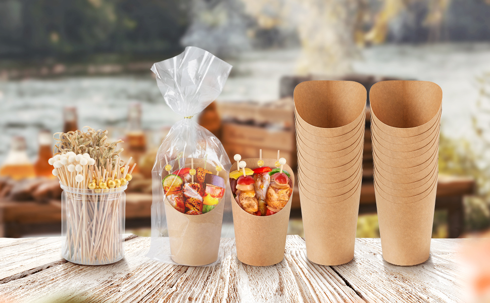 Charcuterie Cups are made of thickened kraft paper. They are completely waterproof. Even oil cannot penetrate the paper cups. The bottom of the cup is very stable.Suitable as a container for any snack food.