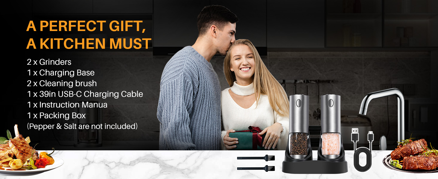 The Automatic Salt and Pepper Grinder Set comes with a salt grinder, a pepper grinder, and a dual charging base for freshly ground spices at the push of a button, for effortless seasoning and better tasting food.