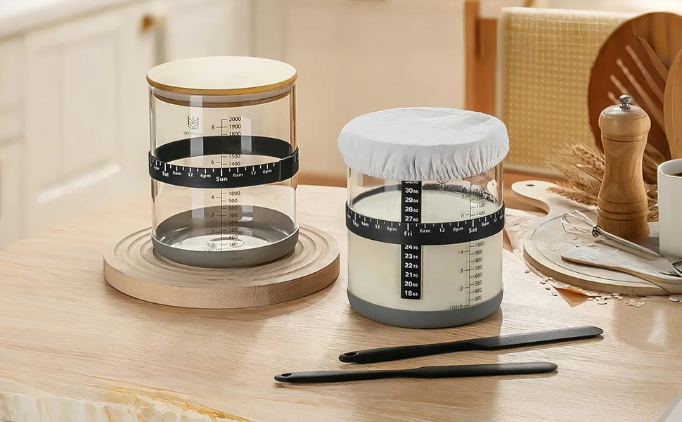 The transparent glass jar has graduated markings of a centimeter ruler to help you determine your starter's rise throughout its fermentation.